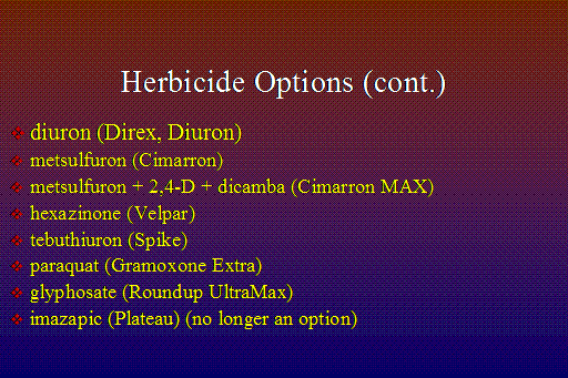 Herbicide Options (cont.)<BR>diuron (Direx, Diuron) <BR>metsulfuron (Cimarron) <BR>metsulfuron + 2,4-D + dicamba (Cimarron MAX)  <BR>hexazinone (Velpar) <BR>tebuthiuron (Spike) <BR>paraquat (Gramoxone Extra) <BR>glyphosate (Roundup UltraMax) <BR>imazapic (Plateau) (no longer an option) <BR>