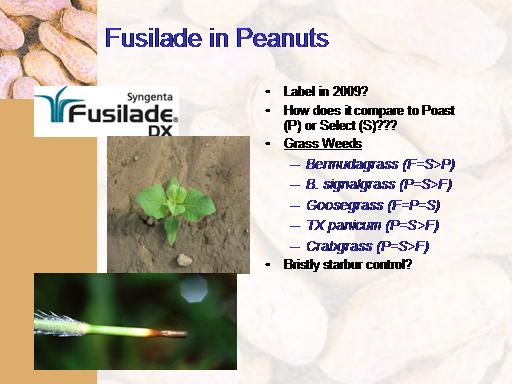 Fusilade in Peanuts<BR>Label in 2009? <BR>How does it compare to Poast (P) or Select (S)??? <BR>Grass Weeds <BR>Bermudagrass (F=S>P) <BR>B. signalgrass (P=S>F) <BR>Goosegrass (F=P=S) <BR>TX panicum (P=S>F) <BR>Crabgrass (P=S>F) <BR>Bristly starbur control?  <BR>