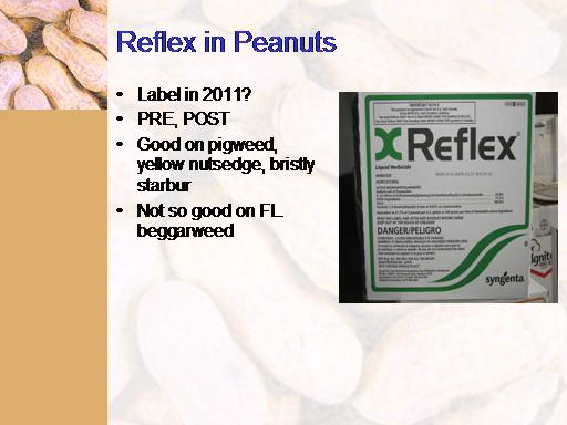 Reflex in Peanuts<BR>Label in 2011? <BR>PRE, POST <BR>Good on pigweed, yellow nutsedge, bristly starbur <BR>Not so good on FL. beggarweed<BR>