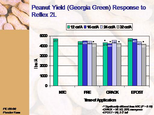 Peanut Yield (Georgia Green) Response to Reflex 2L<BR>PE-09-08 <BR>Ponder Farm<BR>*<BR>*<BR>*<BR>*<BR>*<BR>* Significantly different from NTC (P = 0.10) <BR>CRACK = VE-V2; 20% emergence <BR>EPOST = V6; 2-3’ tall <BR>