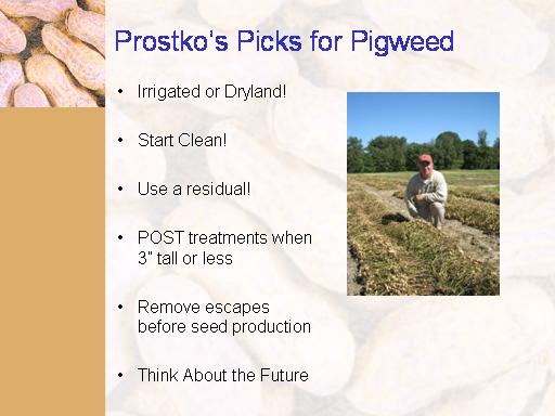 Prostko’s Picks for Pigweed<BR>Irrigated or Dryland! <BR> <BR>Start Clean! <BR> <BR>Use a residual! <BR> <BR>POST treatments when 3” tall or less <BR> <BR>Remove escapes before seed production <BR> <BR>Think About the Future <BR>