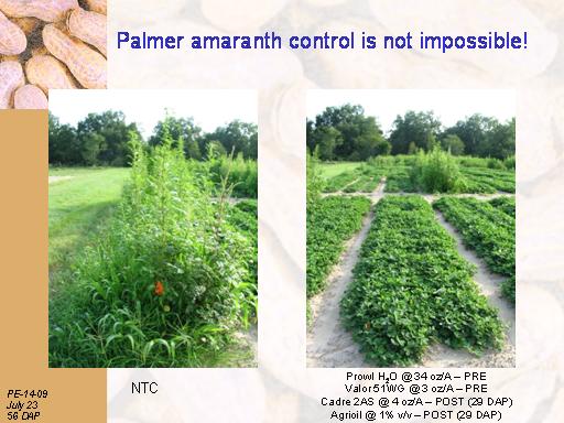 Palmer amaranth control is not impossible!<BR>NTC<BR>Prowl H2O @ 34 oz/A – PRE <BR>Valor 51WG @ 3 oz/A – PRE <BR>Cadre 2AS @ 4 oz/A – POST (29 DAP) <BR>Agrioil @ 1% v/v – POST (29 DAP) <BR>PE-14-09 <BR>July 23 <BR>56 DAP<BR>