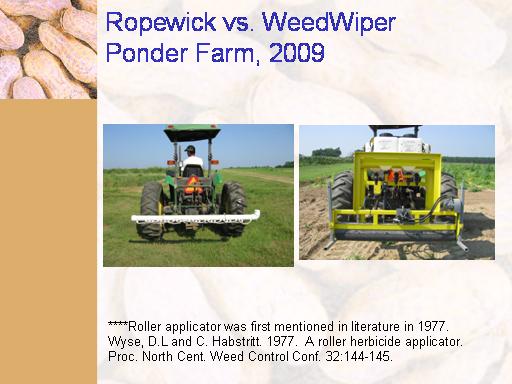 Ropewick vs. WeedWiper Ponder Farm, 2009<BR>****Roller applicator was first mentioned in literature in 1977. <BR>Wyse, D.L and C. Habstritt. 1977.  A roller herbicide applicator.   <BR>Proc. North Cent. Weed Control Conf. 32:144-145.<BR>