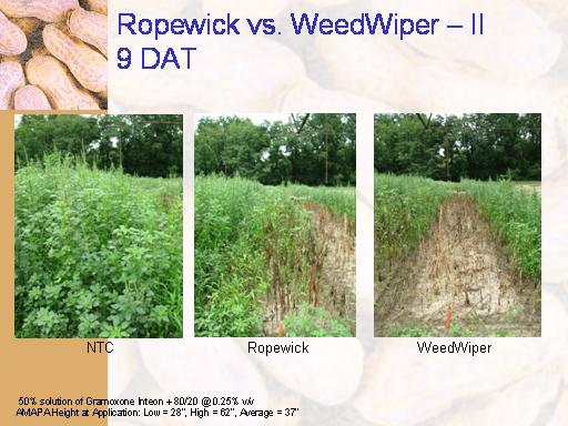 Ropewick vs. WeedWiper – II 9 DAT<BR>NTC<BR>Ropewick<BR>WeedWiper<BR> 50% solution of Gramoxone Inteon + 80/20 @ 0.25% v/v <BR>AMAPA Height at Application: Low = 28”, High = 62”, Average = 37” <BR>