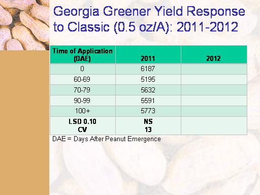 Georgia Greener Yield Response to Classic (0.5 oz/A): 2011-2012<BR>DAE = Days After Peanut Emergence<BR>