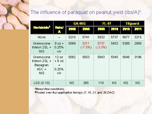 The influence of paraquat on peanut yield (lbs/A)1.<BR>1Weed-free conditions. <BR>2Pooled over four application timings (7, 14, 21, and 28 DAC)<BR>
