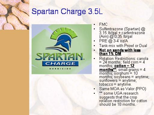 Spartan Charge 3.5L<BR>FMC <BR>Sulfentrazone (Spartan) @ 3.15 lb/gal + carfentrazone (Aim) @ 0.35 lb/gal <BR>PRE @ 3-4 oz/A <BR>Tank-mix with Prowl or Dual <BR>Not on sands with less than 1% OM <BR>Rotation Restrictions: canola = 24 months; field corn = 4 months; cotton = 12 months**; small grains = 4 months; sorghum = 10 months; soybeans = anytime; sunflowers = anytime; tobacco = anytime. <BR>Same MOA as Valor (PPO) <BR>** some UGA research suggests that the crop rotation restriction for cotton should be 18 months. <BR>