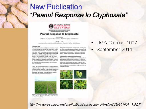 New Publication “Peanut Response to Glyphosate”<BR>UGA Circular 1007 <BR>September 2011<BR>http://www.caes.uga.edu/applications/publications/files/pdf/C%201007_1.PDF<BR>