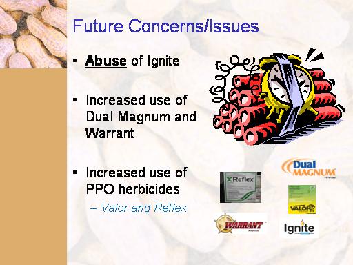 Future Concerns/Issues<BR>Abuse of Ignite <BR> <BR>Increased use of Dual Magnum and Warrant <BR> <BR>Increased use of PPO herbicides <BR>Valor and Reflex<BR>