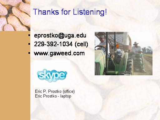 Thanks for Listening!<BR>eprostko@uga.edu <BR>229-392-1034 (cell) <BR>www.gaweed.com<BR>Eric P. Prostko (office) <BR>Eric Prostko - laptop<BR>