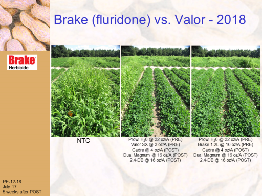 Brake (fluridone) vs. Valor - 2018<BR>PE-12-18 <BR>July 17  <BR>5 weeks after POST<BR>NTC<BR>Prowl H20 @ 32 oz/A (PRE) <BR>Valor SX @ 3 oz/A (PRE) <BR>Cadre @ 4 oz/A (POST) <BR>Dual Magnum @ 16 oz/A (POST) <BR>2,4-DB @ 16 oz/A (POST)<BR>Prowl H20 @ 32 oz/A (PRE) <BR>Brake 1.2L @ 16 oz/A (PRE) <BR>Cadre @ 4 oz/A (POST) <BR>Dual Magnum @ 16 oz/A (POST) <BR>2,4-DB @ 16 oz/A (POST)<BR>