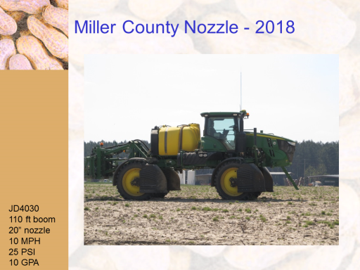 Miller County Nozzle - 2018<BR>JD4030 <BR>110 ft boom <BR>20” nozzle <BR>10 MPH <BR>25 PSI <BR>10 GPA<BR>