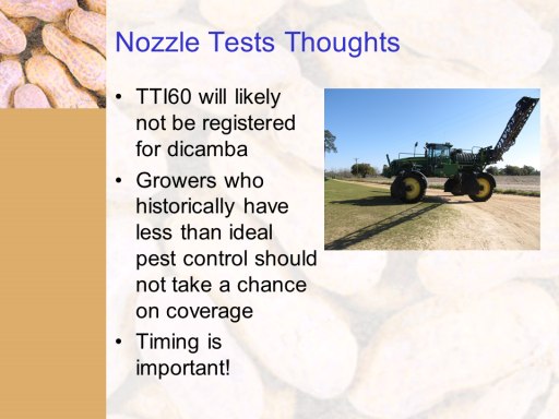 Nozzle Tests Thoughts<BR>TTI60 will likely  not be registered for dicamba <BR>Growers who historically have  less than ideal pest control should not take a chance on coverage <BR>Timing is important!<BR>