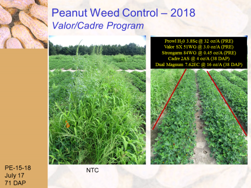 Peanut Weed Control – 2018 Valor/Cadre Program<BR>PE-15-18 <BR>July 17 <BR>71 DAP<BR>NTC<BR>Prowl H20 3.8Sc @ 32 oz/A (PRE) <BR>Valor SX 51WG @ 3.0 oz/A (PRE) <BR>Strongarm 84WG @ 0.45 oz/A (PRE) <BR>Cadre 2AS @ 4 oz/A (38 DAP) <BR>Dual Magnum 7.62EC @ 16 oz/A (38 DAP)<BR>