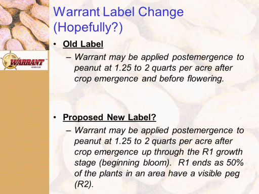 Warrant Label Change (Hopefully?)<BR>Old Label <BR>Warrant may be applied postemergence to peanut at 1.25 to 2 quarts per acre after crop emergence and before flowering. <BR> <BR> <BR>Proposed New Label? <BR>Warrant may be applied postemergence to peanut at 1.25 to 2 quarts per acre after crop emergence up through the R1 growth stage (beginning bloom).  R1 ends as 50% of the plants in an area have a visible peg (R2).  <BR>