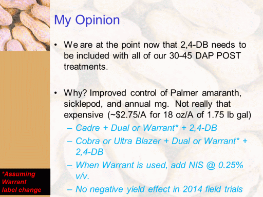 My Opinion<BR>We are at the point now that 2,4-DB needs to be included with all of our 30-45 DAP POST treatments. <BR> <BR>Why? Improved control of Palmer amaranth, sicklepod, and annual mg.  Not really that expensive (~$2.75/A for 18 oz/A of 1.75 lb gal) <BR>Cadre + Dual or Warrant* + 2,4-DB <BR>Cobra or Ultra Blazer + Dual or Warrant* + 2,4-DB <BR>When Warrant is used, add NIS @ 0.25% v/v. <BR>No negative yield effect in 2014 field trials <BR>*Assuming Warrant <BR>label change<BR>