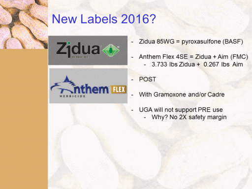 New Labels 2016?<BR>Zidua 85WG = pyroxasulfone (BASF) <BR> <BR>Anthem Flex 4SE = Zidua + Aim (FMC) <BR>3.733 lbs Zidua +  0.267 lbs  Aim <BR> <BR>POST <BR> <BR>With Gramoxone and/or Cadre <BR> <BR>UGA will not support PRE use <BR>Why? No 2X safety margin<BR>