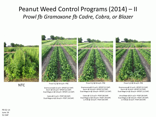 Peanut Weed Control Programs (2014) – II Prowl fb Gramoxone fb Cadre, Cobra, or Blazer<BR>PE-02-14 <BR>June 26  <BR>52 DAP<BR>NTC<BR>Prowl H20 @ 34 oz/A – PRE <BR> <BR>Gramoxone @ 12 oz/A – EPOST (22 DAP) <BR>Storm @ 16 oz/A – EPOST (22 DAP) <BR>Dual Magnum @ 16 oz/A – EPOST ( 22 DAP) <BR> <BR>Cadre @ 4 oz/A – POST (36 DAP) <BR>Dual Magnum @ 16 oz/A – POST ( 36 DAP)<BR>Prowl H20 @ 34 oz/A - PRE <BR> <BR>Gramoxone @ 12 oz/A – EPOST (22 DAP) <BR>Storm @ 16 oz/A – EPOST (22 DAP) <BR>Dual Magnum @ 16 oz/A – EPOST ( 22 DAP) <BR> <BR>Cobra @ 12.5 oz/A – POST (36 DAP) <BR>Dual Magnum @ 16 oz/A – POST ( 36 DAP) <BR>2,4-DB @ 18 oz/A – POST (36 DAP)<BR>Prowl H20 @ 34 oz/A - PRE <BR> <BR>Gramoxone @ 12 oz/A – EPOST (22 DAP) <BR>Storm @ 16 oz/A – EPOST (22 DAP) <BR>Dual Magnum @ 16 oz/A – EPOST ( 22 DAP) <BR> <BR>Ultra Blazer @ 24  oz/A – POST (36 DAP) <BR>Dual Magnum @ 16 oz/A – POST ( 36 DAP) <BR>2,4-DB @ 18 oz/A – POST (36 DAP)<BR>