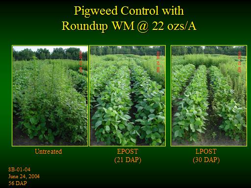 Pigweed Control with  Roundup WM @ 22 ozs/A<BR>Untreated<BR>EPOST <BR>(21 DAP)<BR>LPOST <BR>(30 DAP)<BR>SB-01-04 <BR>June 24, 2004 <BR>56 DAP <BR>