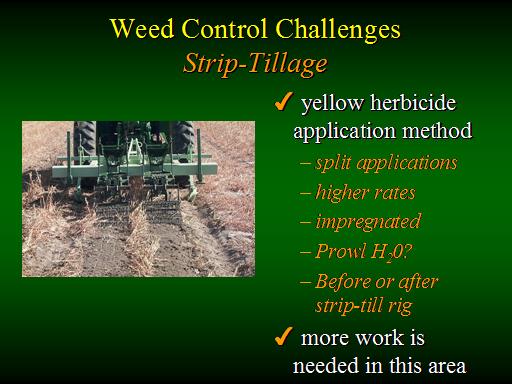 Weed Control Challenges Strip-Tillage<BR> yellow herbicide application method <BR>split applications <BR>higher rates <BR>impregnated <BR>Prowl H20? <BR>Before or after strip-till rig <BR> more work is needed in this area<BR>