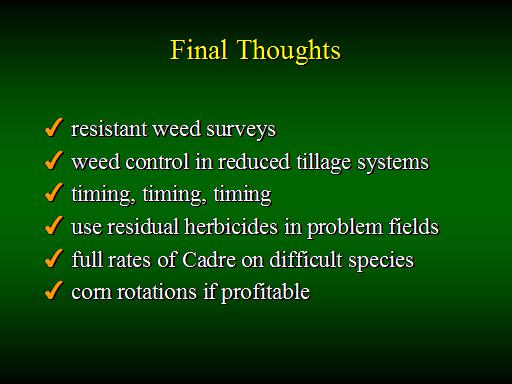 Final Thoughts <BR> resistant weed surveys <BR> weed control in reduced tillage systems <BR> timing, timing, timing <BR> use residual herbicides in problem fields <BR> full rates of Cadre on difficult species <BR> corn rotations if profitable<BR>