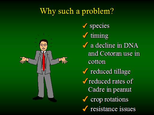Why such a problem?<BR> species <BR> timing <BR> a decline in DNA and Cotoran use in cotton <BR> reduced tillage <BR>reduced rates of Cadre in peanut <BR> crop rotations <BR> resistance issues<BR>
