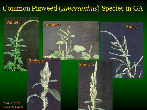 Common Pigweed (Amaranthus) Species in GA<BR>Palmer<BR>Slender<BR>Spiny<BR>Redroot<BR>Smooth<BR>Photos: SWSS <BR>Weed ID Guide<BR>
