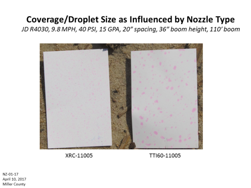 Coverage/Droplet Size as Influenced by Nozzle Type JD R4030, 9.8 MPH, 40 PSI, 15 GPA, 20” spacing, 36” boom height, 110’ boom<BR>XRC-11005<BR>TTI60-11005<BR>NZ-01-17 <BR>April 10, 2017 <BR>Miller County<BR>