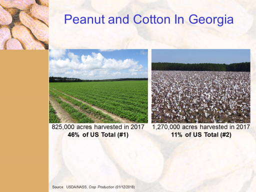 Peanut and Cotton In Georgia<BR>825,000 acres harvested in 2017 <BR>46% of US Total (#1)<BR>1,270,000 acres harvested in 2017 <BR>11% of US Total (#2)<BR>Source:  USDA/NASS, Crop Production (01/12/2018)<BR>