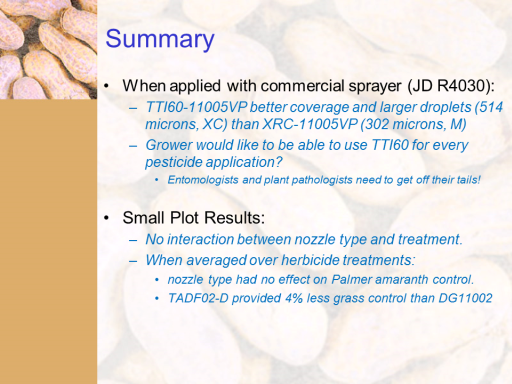 Summary<BR>When applied with commercial sprayer (JD R4030): <BR>TTI60-11005VP better coverage and larger droplets (514 microns, XC) than XRC-11005VP (302 microns, M)  <BR>Grower would like to be able to use TTI60 for every pesticide application? <BR>Entomologists and plant pathologists need to get off their tails! <BR> <BR>Small Plot Results: <BR>No interaction between nozzle type and treatment. <BR>When averaged over herbicide treatments: <BR>nozzle type had no effect on Palmer amaranth control. <BR>TADF02-D provided 4% less grass control than DG11002<BR>