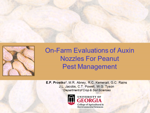On-Farm Evaluations of Auxin Nozzles For Peanut  Pest Management<BR>E.P. Prostko1, M.R. Abney, R.C. Kemerait, G.C. Rains <BR>J.L. Jacobs, C.T. Powell, W.G. Tyson <BR>1Department of Crop & Soil Sciences<BR>