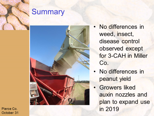 Summary<BR>No differences in weed, insect, disease control observed except for 3-CAH in Miller Co.  <BR>No differences in peanut yield <BR>Growers liked auxin nozzles and plan to expand use in 2019  <BR>Pierce Co. <BR>October 31<BR>