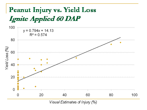 Peanut Injury vs. Yield Loss Ignite Applied 60 DAP<BR>Visual Estimates of Injury (%)<BR>Yield Loss (%)<BR>