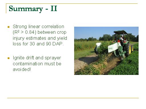 Summary - II<BR> <BR>Strong linear correlation (R2 > 0.84) between crop injury estimates and yield loss for 30 and 90 DAP. <BR> <BR>Ignite drift and sprayer contamination must be avoided! <BR>