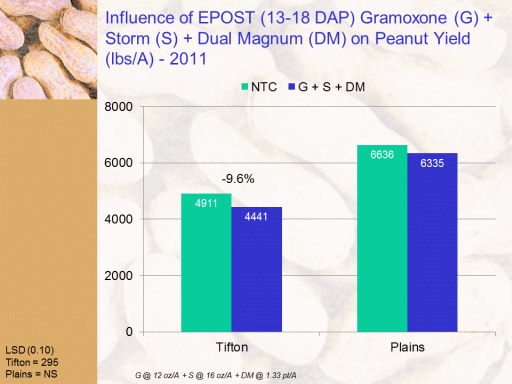 Influence of EPOST (13-18 DAP) Gramoxone (G) +  Storm (S) + Dual Magnum (DM) on Peanut Yield (lbs/A) - 2011<BR>LSD (0.10) <BR>Tifton = 295 <BR>Plains = NS<BR>-9.6%<BR>G @ 12 oz/A + S @ 16 oz/A + DM @ 1.33 pt/A<BR>