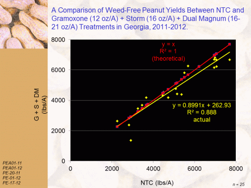 A Comparison of Weed-Free Peanut Yields Between NTC and Gramoxone (12 oz/A) + Storm (16 oz/A) + Dual Magnum (16-21 oz/A) Treatments in Georgia, 2011-2012.<BR>NTC (lbs/A)<BR>G + S + DM <BR>(lbs/A)<BR>PEA01-11 <BR>PEA01-12 <BR>PE-20-11 <BR>PE-01-12 <BR>PE-17-12<BR>n = 25<BR>