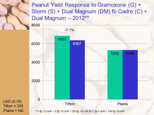 Peanut Yield Response to Gramoxone (G) + Storm (S) + Dual Magnum (DM) fb Cadre (C) + Dual Magnum – 2012**<BR>-7.1%<BR>**G @ 12 oz/A + S @ 16 oz/A + DM @ 16 oz/A fb C @ 4 oz/A + DM @ 16 oz/A<BR>LSD (0.10) <BR>Tifton = 355 <BR>Plains = NS <BR>