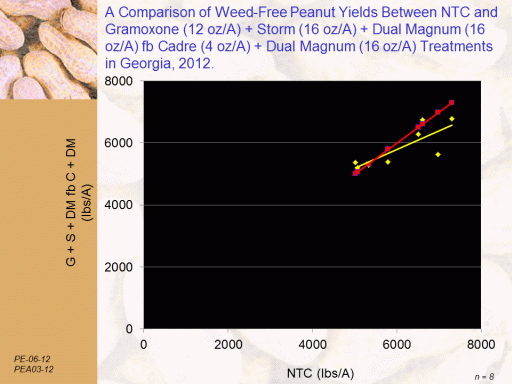 A Comparison of Weed-Free Peanut Yields Between NTC and Gramoxone (12 oz/A) + Storm (16 oz/A) + Dual Magnum (16 oz/A) fb Cadre (4 oz/A) + Dual Magnum (16 oz/A) Treatments in Georgia, 2012.<BR>NTC (lbs/A)<BR>G + S + DM fb C + DM <BR>(lbs/A)<BR>PE-06-12 <BR>PEA03-12<BR>n = 8<BR>