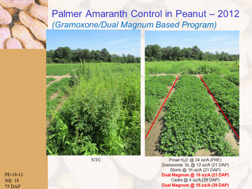 Palmer Amaranth Control in Peanut – 2012 (Gramoxone/Dual Magnum Based Program)<BR>PE-18-12 <BR>July 18 <BR>75 DAP<BR>NTC<BR>Prowl H2O @ 34 oz/A (PRE) <BR>Gramoxone SL @ 12 oz/A (21 DAP) <BR>Storm @ 16 oz/A (21 DAP) <BR>Dual Magnum @ 16 oz/A (21 DAP) <BR>Cadre @ 4 oz/A (39 DAP) <BR>Dual Magnum @ 16 oz/A (39 DAP)<BR>