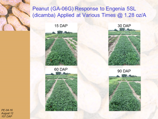 Peanut (GA-06G) Response to Engenia 5SL (dicamba) Applied at Various Times @ 1.28 oz/A<BR>PE-04-16 <BR>August 12 <BR>107 DAP<BR>15 DAP<BR>60 DAP<BR>90 DAP<BR>15 DAP<BR>30 DAP<BR>60 DAP<BR>90 DAP<BR>