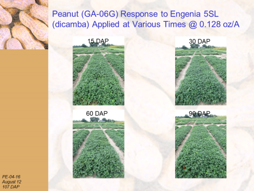 Peanut (GA-06G) Response to Engenia 5SL (dicamba) Applied at Various Times @ 0.128 oz/A<BR>PE-04-16 <BR>August 12 <BR>107 DAP<BR>15 DAP<BR>30 DAP<BR>60 DAP<BR>90 DAP<BR>15 DAP<BR>30 DAP<BR>60 DAP<BR>90 DAP<BR>