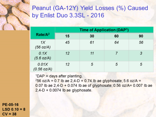 Peanut (GA-12Y) Yield Losses (%) Caused by Enlist Duo 3.3SL - 2016<BR>1DAP = days after planting. <BR>256 oz/A = 0.7 lb ae 2,4-D + 0.74 lb ae glyphosate; 5.6 oz/A = <BR>0.07 lb ae 2,4-D + 0.074 lb ae of glyphosate; 0.56 oz/A= 0.007 lb ae  <BR>2,4-D + 0.0074 lb ae glyphosate.<BR>PE-05-16 <BR>LSD 0.10 = 8 <BR>CV = 38<BR>