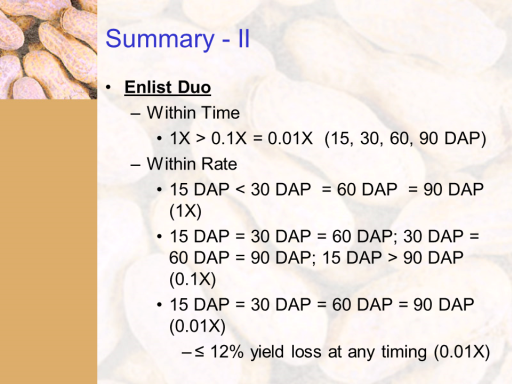 Summary - II<BR>Enlist Duo <BR>Within Time <BR>1X > 0.1X = 0.01X  (15, 30, 60, 90 DAP) <BR>Within Rate <BR>15 DAP < 30 DAP  = 60 DAP  = 90 DAP (1X) <BR>15 DAP = 30 DAP = 60 DAP; 30 DAP = 60 DAP = 90 DAP; 15 DAP > 90 DAP (0.1X) <BR>15 DAP = 30 DAP = 60 DAP = 90 DAP (0.01X)  <BR>= 12% yield loss at any timing (0.01X) <BR>