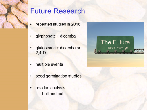 Future Research<BR>repeated studies in 2016 <BR> <BR>glyphosate + dicamba <BR> <BR>glufosinate + dicamba or 2,4-D <BR> <BR>multiple events <BR> <BR>seed germination studies <BR> <BR>residue analysis <BR>hull and nut<BR>