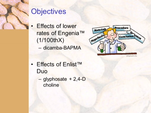 Objectives<BR>Effects of lower rates of Engenia™ (1/100thX) <BR>dicamba-BAPMA <BR> <BR>Effects of Enlist™ Duo <BR>glyphosate + 2,4-D choline<BR>