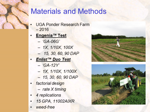 Materials and Methods<BR>UGA Ponder Research Farm – 2016 <BR>Engenia™ Test <BR>‘GA-06G’ <BR>1X, 1/10X, 100X <BR> 15, 30, 60, 90 DAP <BR>Enlist™ Duo Test <BR>‘GA-12Y’ <BR>1X, 1/10X, 1/100X <BR>15, 30, 60, 90 DAP <BR>factorial design <BR>rate X timing <BR>4 replications <BR>15 GPA, 11002AIXR <BR>weed-free <BR> <BR>