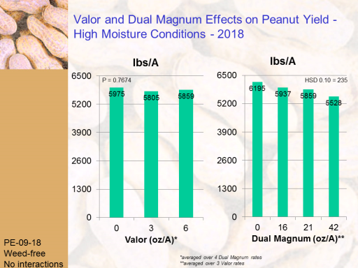 Valor and Dual Magnum Effects on Peanut Yield - High Moisture Conditions - 2018 <BR>PE-09-18 <BR>Weed-free <BR>No interactions<BR>P = 0.7674<BR>HSD 0.10 = 235<BR>*averaged over 4 Dual Magnum rates <BR>**averaged over 3 Valor rates<BR>