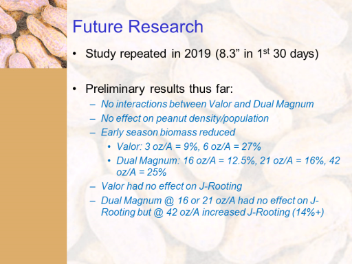 Future Research<BR>Study repeated in 2019 (8.3” in 1st 30 days) <BR> <BR>Preliminary results thus far: <BR>No interactions between Valor and Dual Magnum <BR>No effect on peanut density/population <BR>Early season biomass reduced <BR>Valor: 3 oz/A = 9%, 6 oz/A = 27% <BR>Dual Magnum: 16 oz/A = 12.5%, 21 oz/A = 16%, 42 oz/A = 25% <BR>Valor had no effect on J-Rooting <BR>Dual Magnum @ 16 or 21 oz/A had no effect on J-Rooting but @ 42 oz/A increased J-Rooting (14%+) <BR>