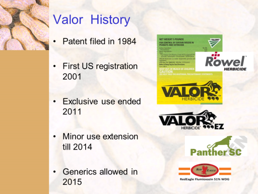 Valor  History<BR>Patent filed in 1984 <BR> <BR>First US registration 2001 <BR> <BR>Exclusive use ended 2011 <BR> <BR>Minor use extension till 2014 <BR> <BR>Generics allowed in 2015<BR>