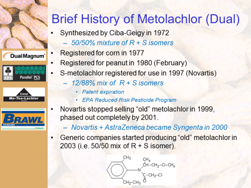 Brief History of Metolachlor (Dual)<BR>Synthesized by Ciba-Geigy in 1972 <BR>50/50% mixture of R + S isomers <BR>Registered for corn in 1977 <BR>Registered for peanut in 1980 (February) <BR>S-metolachlor registered for use in 1997 (Novartis) <BR>12/88% mix of  R + S isomers <BR>Patent expiration <BR>EPA Reduced Risk Pesticide Program <BR>Novartis stopped selling “old” metolachlor in 1999, phased out completely by 2001.  <BR>Novartis + AstraZeneca became Syngenta in 2000  <BR>Generic companies started producing “old” metolachlor in 2003 (i.e. 50/50 mix of R + S isomer). <BR>